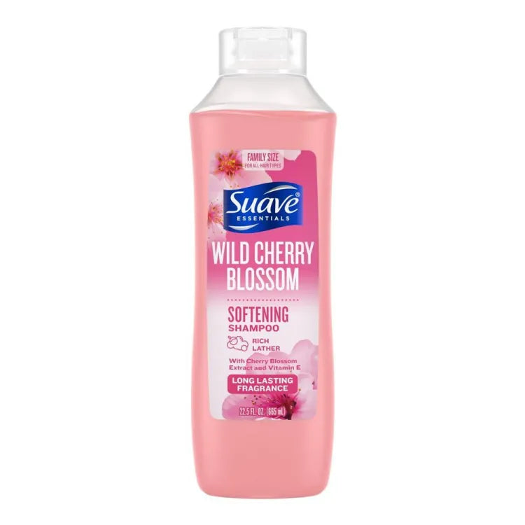 It’s time for a floral escape with Suave Essentials Wild Cherry Blossom Shampoo! This softening shampoo infused with Cherry Blossom Extract and Vitamin E is the perfect cleanser for sweet-smelling, healthy-looking hair.Softening shampoo gently cleanses hairEnjoy the garden scents of cherry blossom accord, peony, and luscious black currantCreated to bring out the natural beauty of your hair, especially when paired with Suave Essentials Wild Cherry Blossom ConditionerHow to use:Wet hair, massage into hair and scalp, then rinse.Disclaimer:Before using a new cosmetic product, test a small area of your skin. Check the ingredients to avoid a reaction if you have a specific allergy or sensitivity. Always read the warning labels and directions on the package before using any cosmetic products. It’s time for a floral escape with Suave Essentials Wild Cherry Blossom Shampoo! This softening shampoo infused with Cherry Blossom Extract and Vitamin E is the perfect cleanser for sweet-smelling, healthy-looking hair. Softening shampoo gently cleanses hairEnjoy the garden scents of cherry blossom accord, peony, and luscious black currantCreated to bring out the natural beauty of your hair, especially when paired with Suave Essentials Wild Cherry Blossom Conditioner Softening shampoo gently cleanses hair Enjoy the garden scents of cherry blossom accord, peony, and luscious black currant Created to bring out the natural beauty of your hair, especially when paired with Suave Essentials Wild Cherry Blossom Conditioner How to use: How to use: Wet hair, massage into hair and scalp, then rinse. Wet hair, massage into hair and scalp, then rinse. Disclaimer: Disclaimer: Before using a new cosmetic product, test a small area of your skin. Check the ingredients to avoid a reaction if you have a specific allergy or sensitivity. Always read the warning labels and directions on the package before using any cosmetic products.